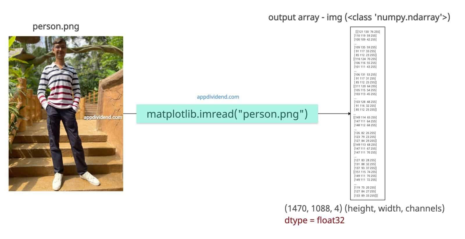 import matplotlib.image as mpimg img = mpimg.imread("person.png") print(type(img)) # Output: <class 'numpy.ndarray'> print(img.shape) # Output: (1470, 1088, 4) print(img.dtype) # Output: float32 if PNG (scaled 0–1), uint8 if JPG
