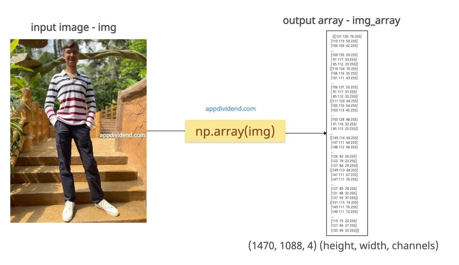 from PIL import Image import numpy as np img = Image.open('person.png') img_array = np.array(img) print(img_array.shape) # Output: (1470, 1088, 4) (height, width, channels) print(img_array[0, 0]) # Output: [121 130 76 255] print(img_array) # Output: # [[[121 130 76 255] # [110 119 59 255] # [100 109 42 255] # ... # [109 135 59 255] # [ 91 117 33 255] # [ 85 112 23 255]] # [[116 124 70 255] # [106 116 55 255] # [101 111 43 255] # ... # [106 131 53 255] # [ 91 117 31 255] # [ 85 112 25 255]] # [[111 120 64 255] # [105 115 54 255] # [103 113 45 255] # ... # [103 128 48 255] # [ 91 116 32 255] # [ 85 112 25 255]] # ... # [[149 114 65 255] # [147 111 64 255] # [148 112 68 255] # ... # [126 82 26 255] # [123 79 23 255] # [127 84 29 255]] # [[149 113 68 255] # [147 111 67 255] # [147 111 70 255] # ... # [127 83 28 255] # [131 88 32 255] # [137 93 37 255]] # [[151 115 74 255] # [149 111 70 255] # [149 111 72 255] # ... # [119 75 20 255] # [127 84 27 255] # [133 89 33 255]]]