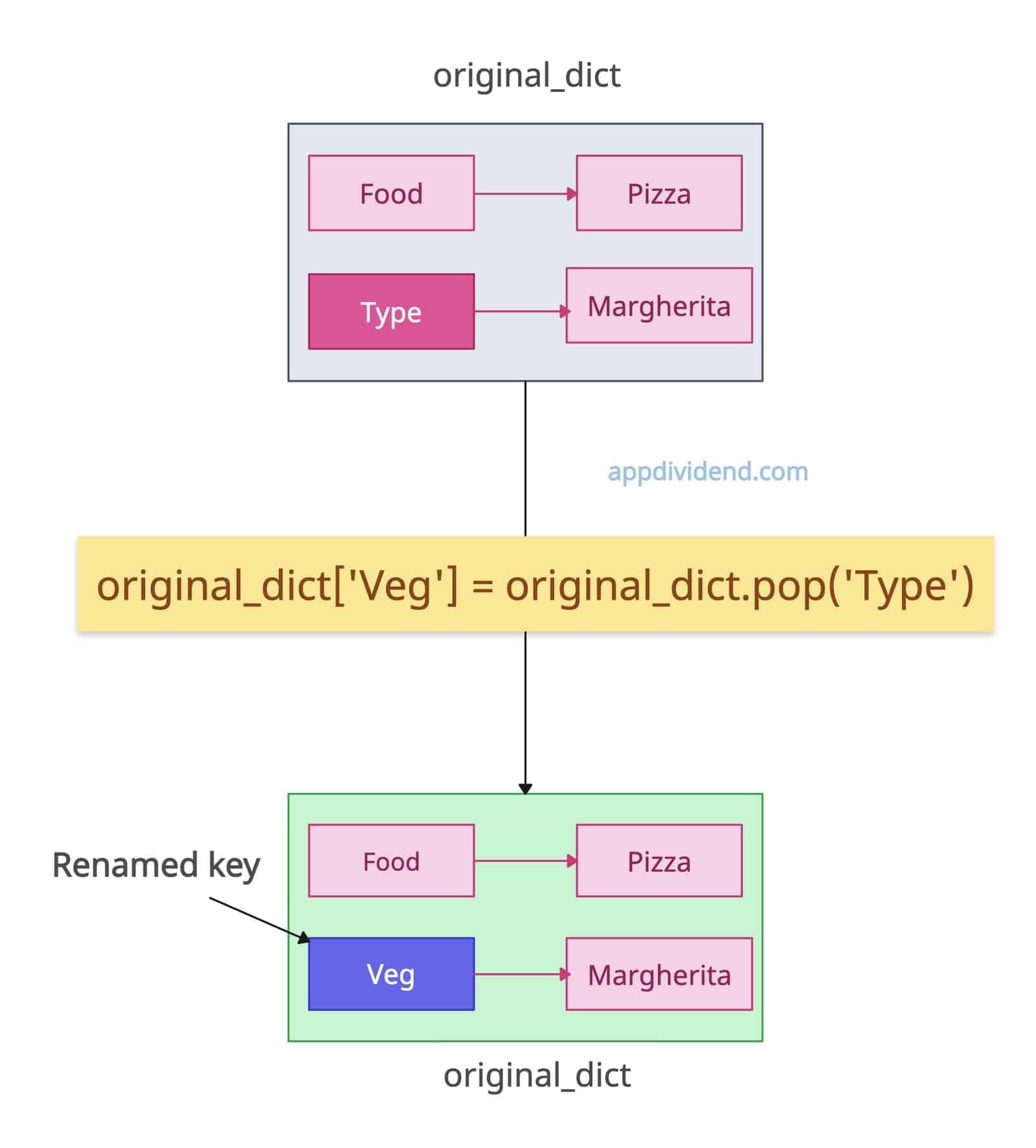 # Output: Before renaming: {'Food': 'Pizza', 'Type': 'Margherita'}
