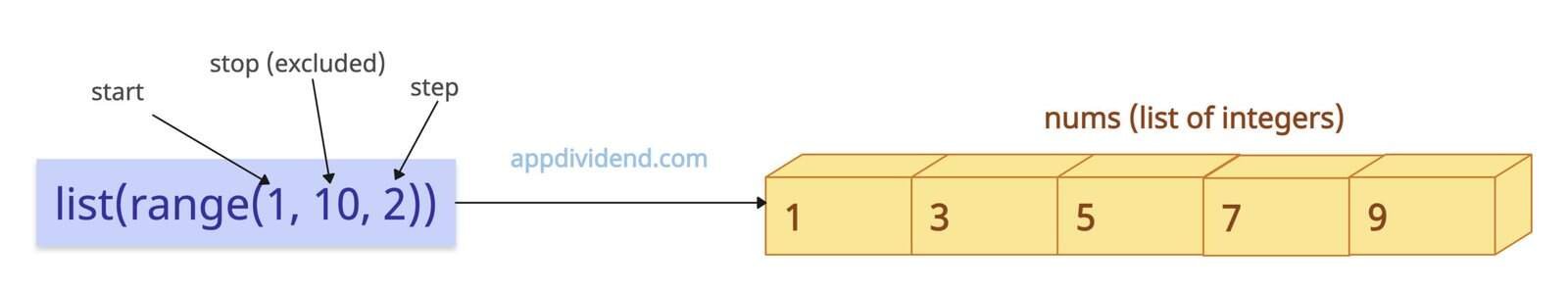 nums = list(range(1, 10, 2)) print(nums) # Output: [1, 3, 5, 7, 9]