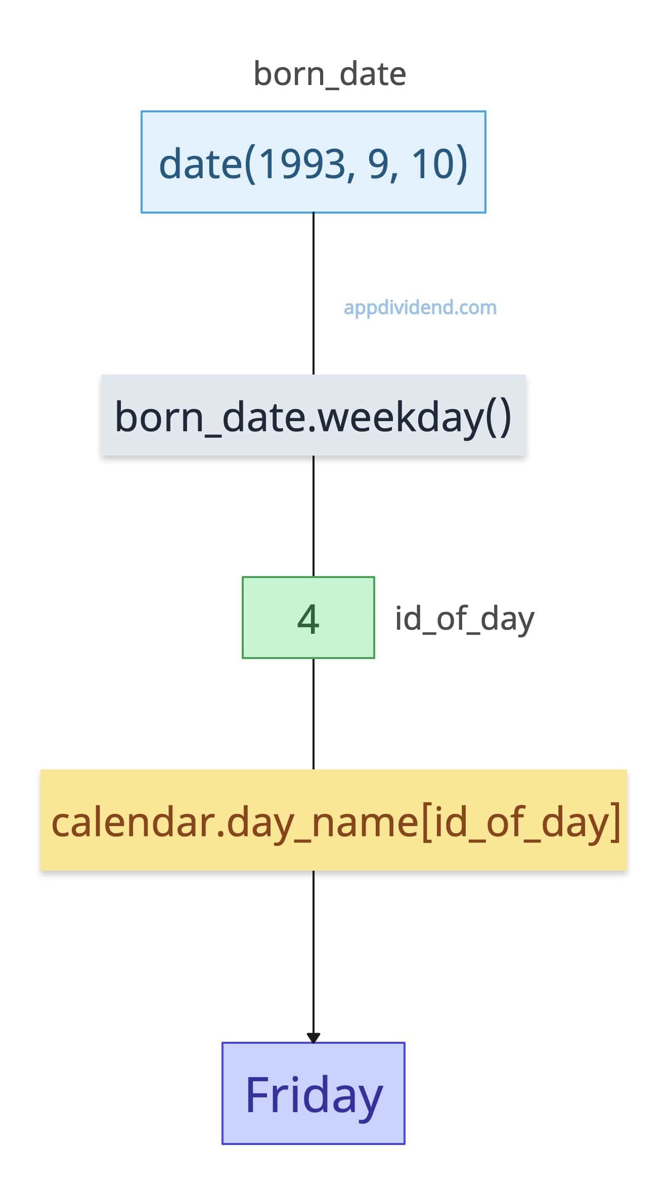from datetime import date import calendar born_date = date(1993, 9, 10) id_of_day = born_date.weekday() print(id_of_day) # 4 (It start from Monday as 0, so Sunday is 6) print(calendar.day_name[id_of_day]) # Friday