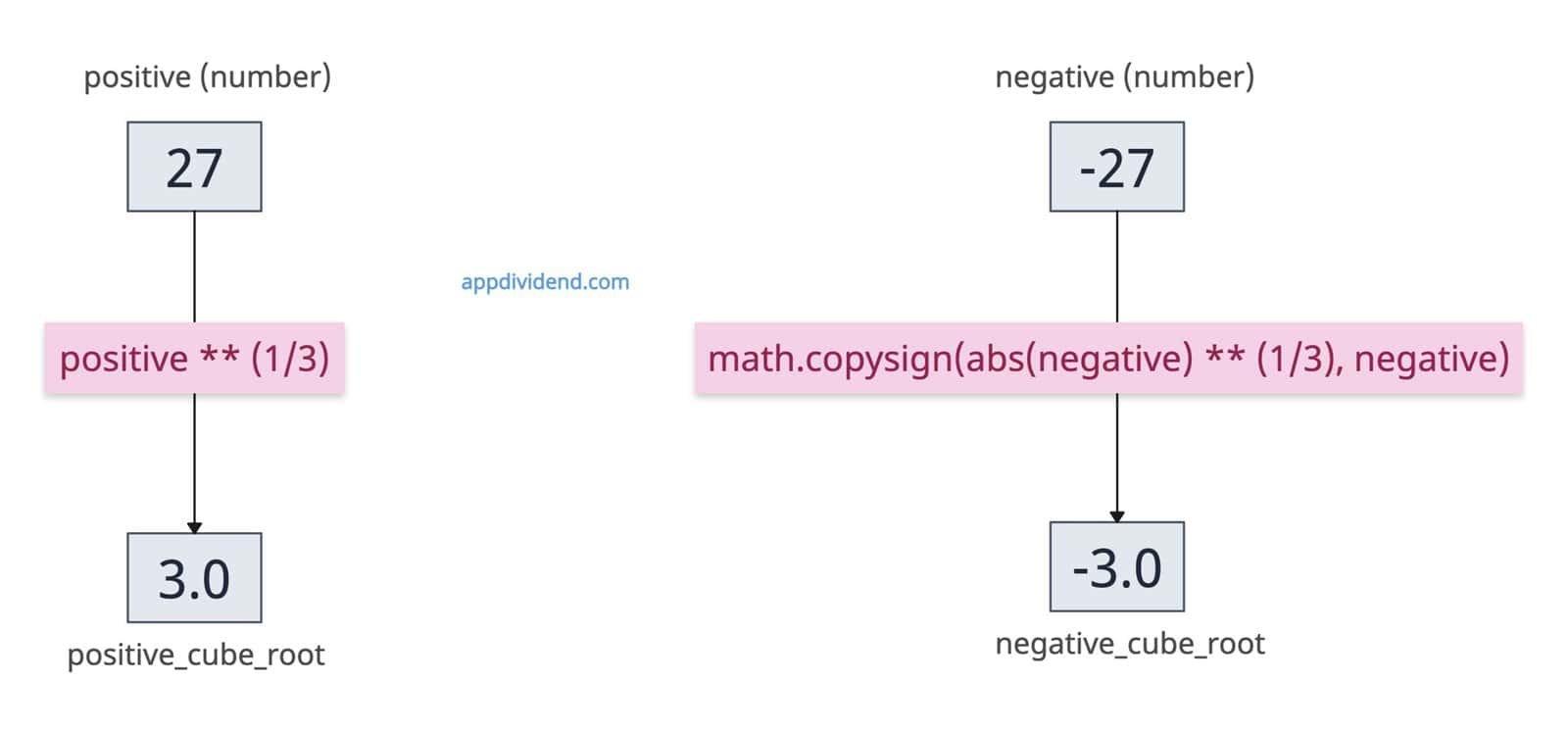 import math positive = 27 negative = -27 # Calculating the cube root positive_cube_root = positive ** (1/3) print(positive_cube_root) # Output: 3.0 negative_cube_root = math.copysign(abs(negative) ** (1/3), negative) print(negative_cube_root) # Output: -3.0