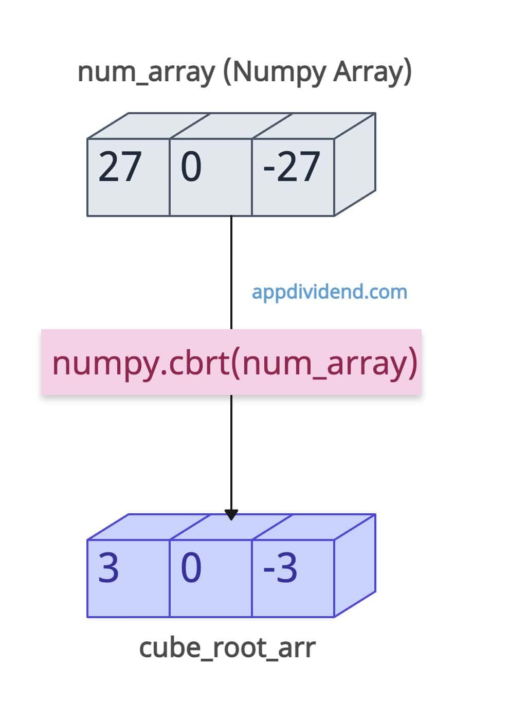 import numpy as np num_array = [27, 0, -27] cube_root_arr = np.cbrt(num_array) print(cube_root_arr) # Output: [ 3. 0. -3.]