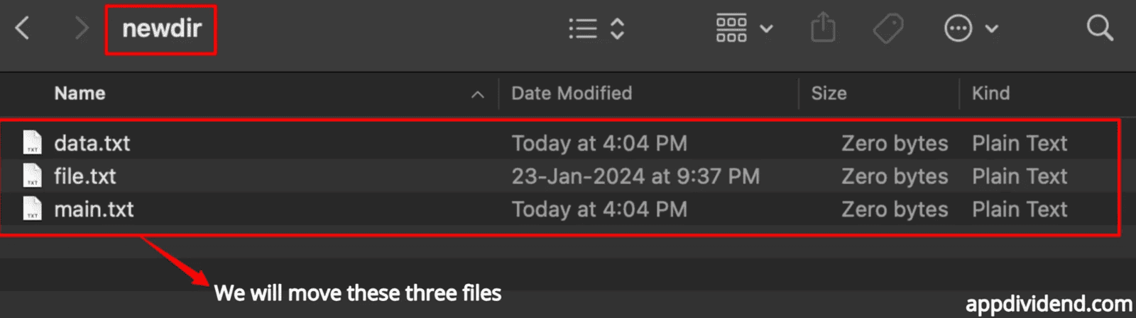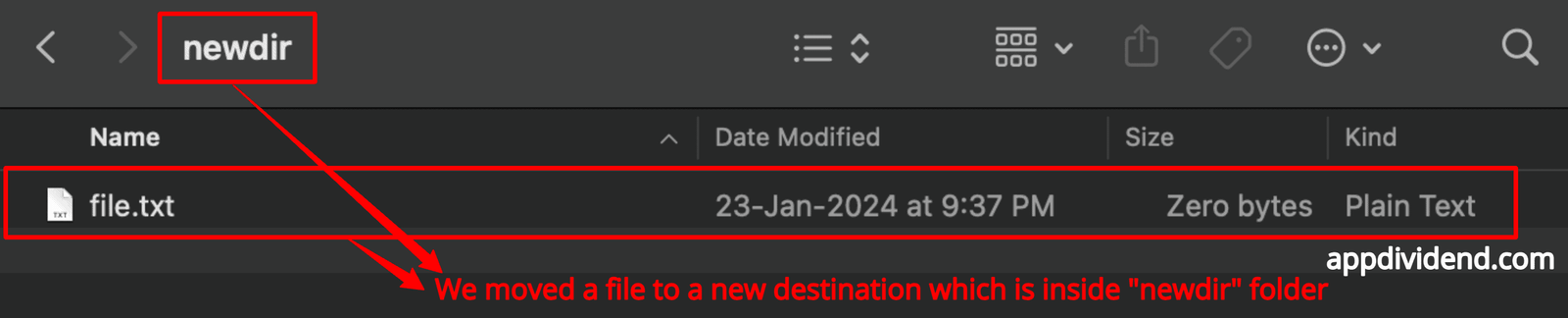 We will move the “file.txt” file to the new destination, which is the “newdir” directory: