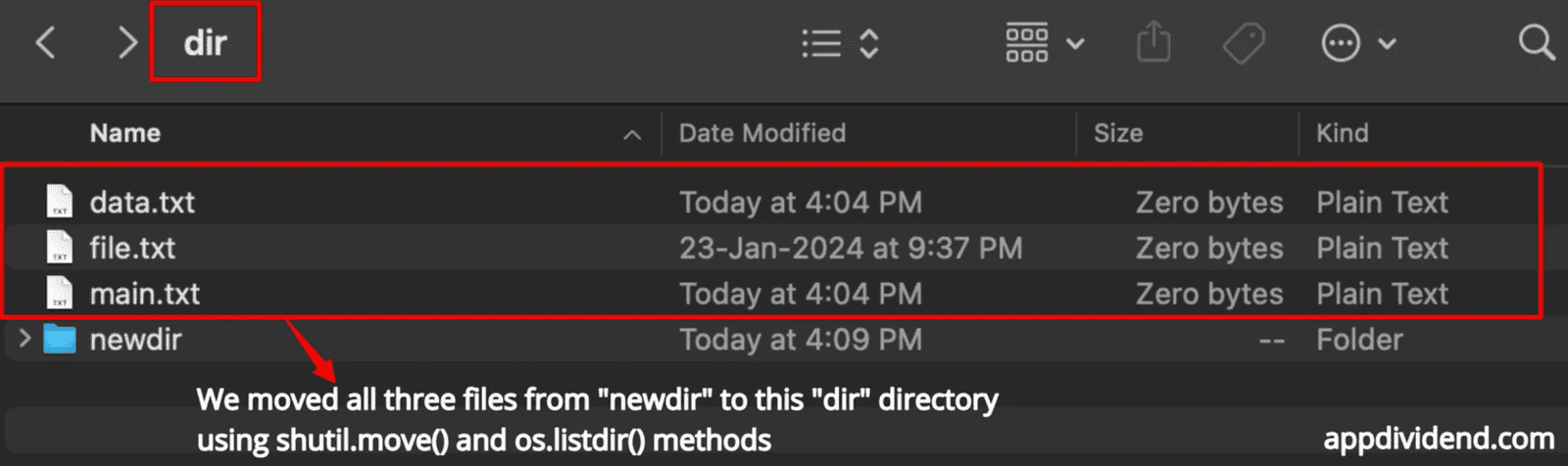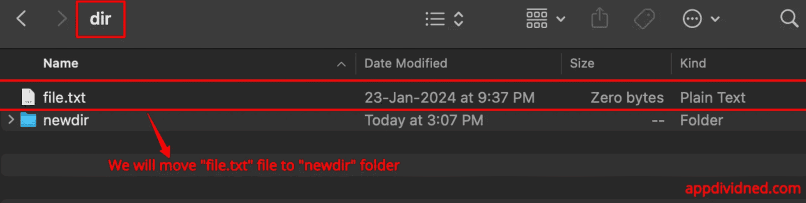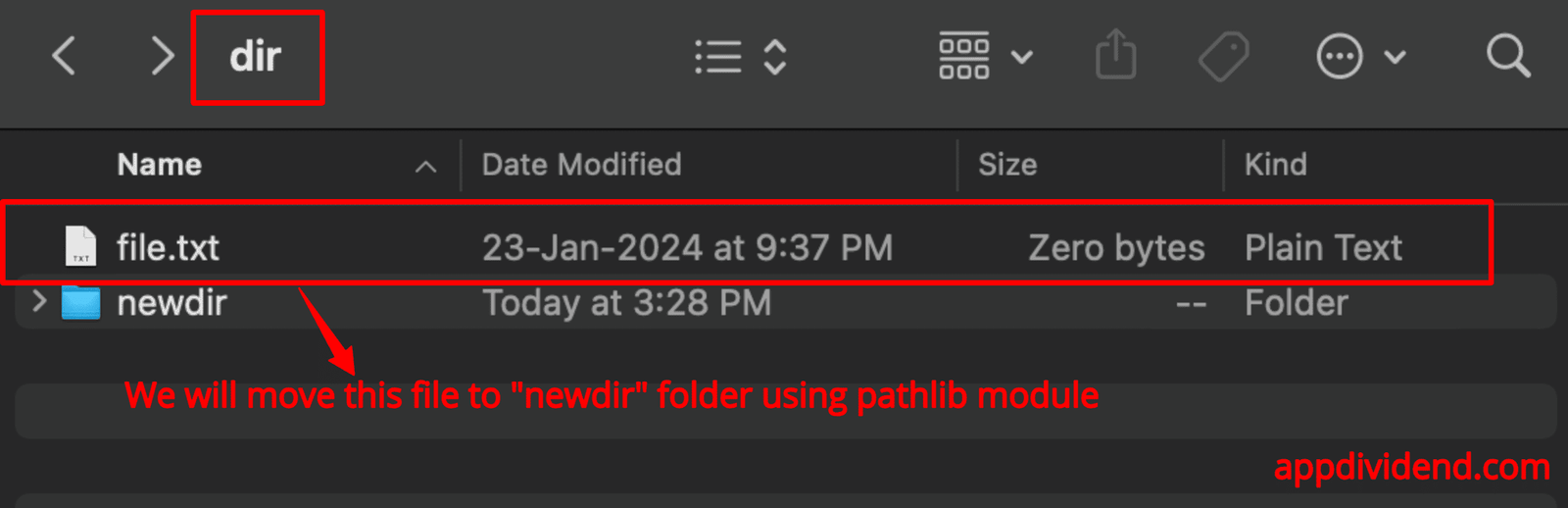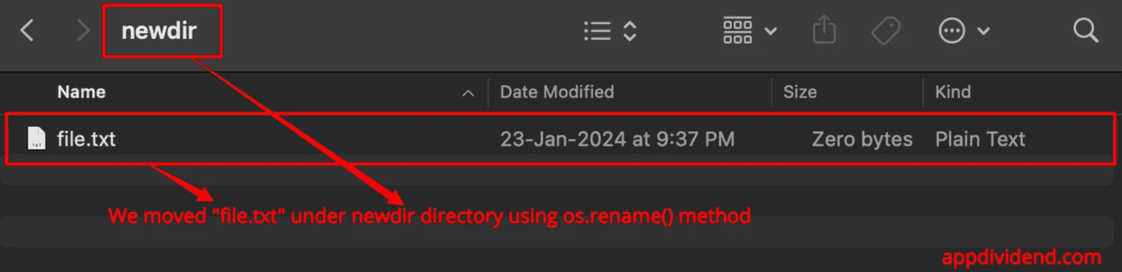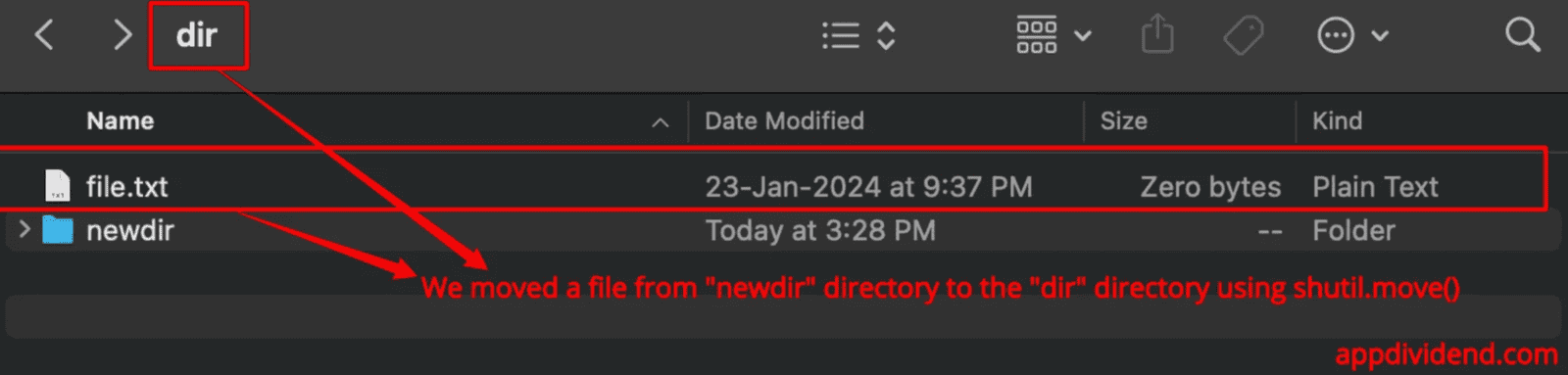 Let’s move a file from one folder to another folder. Before moving a file, our file.txt path relative to the current working directory is dir/newdir/file.txt: