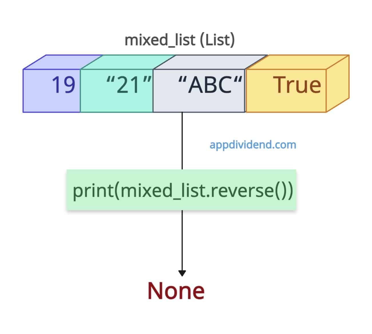 What if the list contains a mix of types? Well, it doesn’t matter, and it returns the modified list in the exact reverse order.