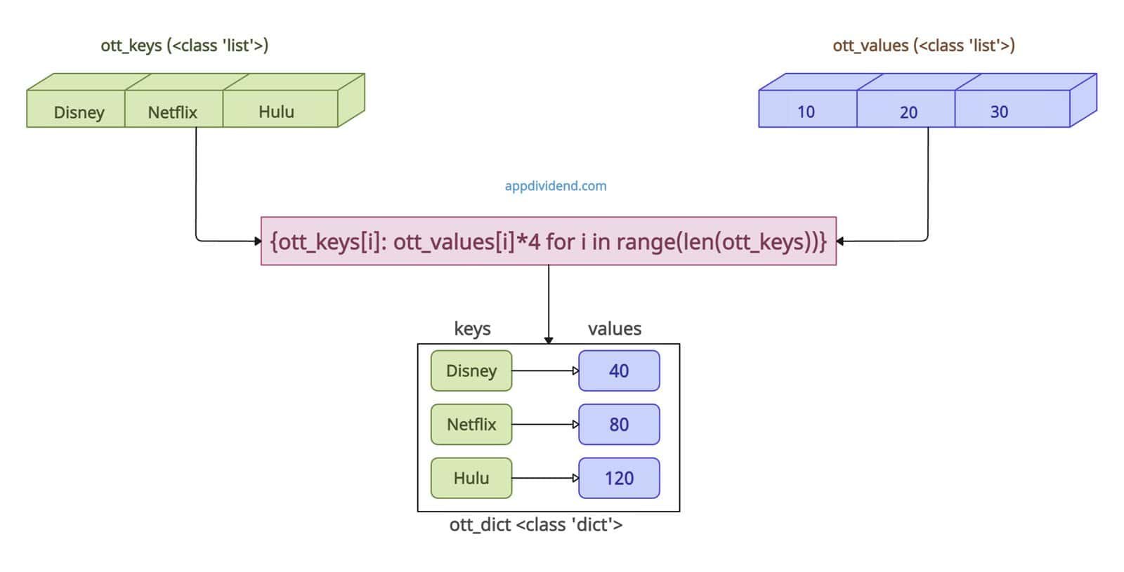Another easy way is dictionary comprehension for two separate input lists. It iterates over the indices of the keys list.