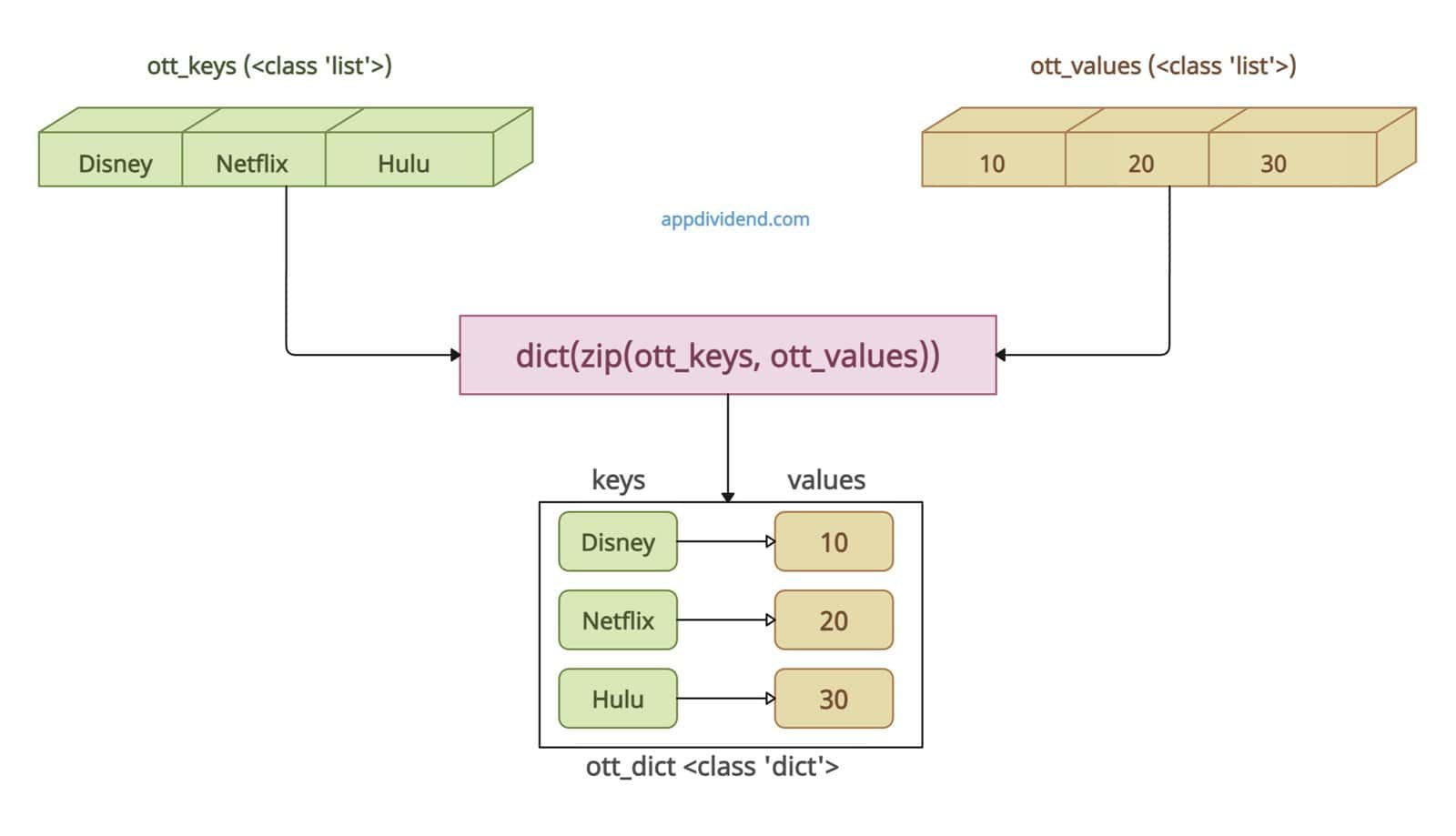 Imagine that you have two parallel lists, one for dict keys and another for dict values. The fastest way to convert them into a dictionary is to use the zip() method in combination with the dict() method.