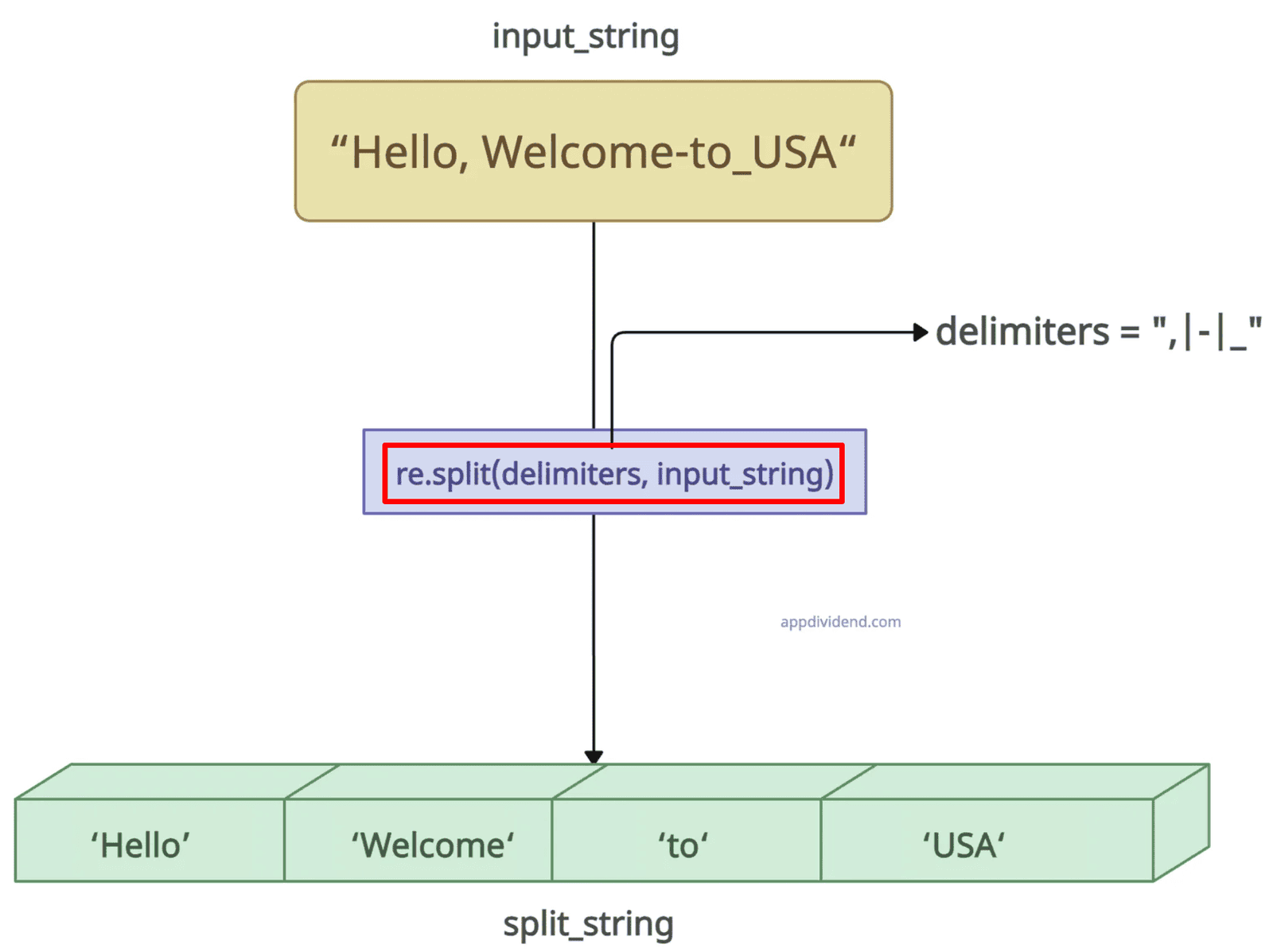 The re.split() function uses a regular expression pattern, where each delimiter is separated by the pipe character (|), which represents an or condition in regular expressions.